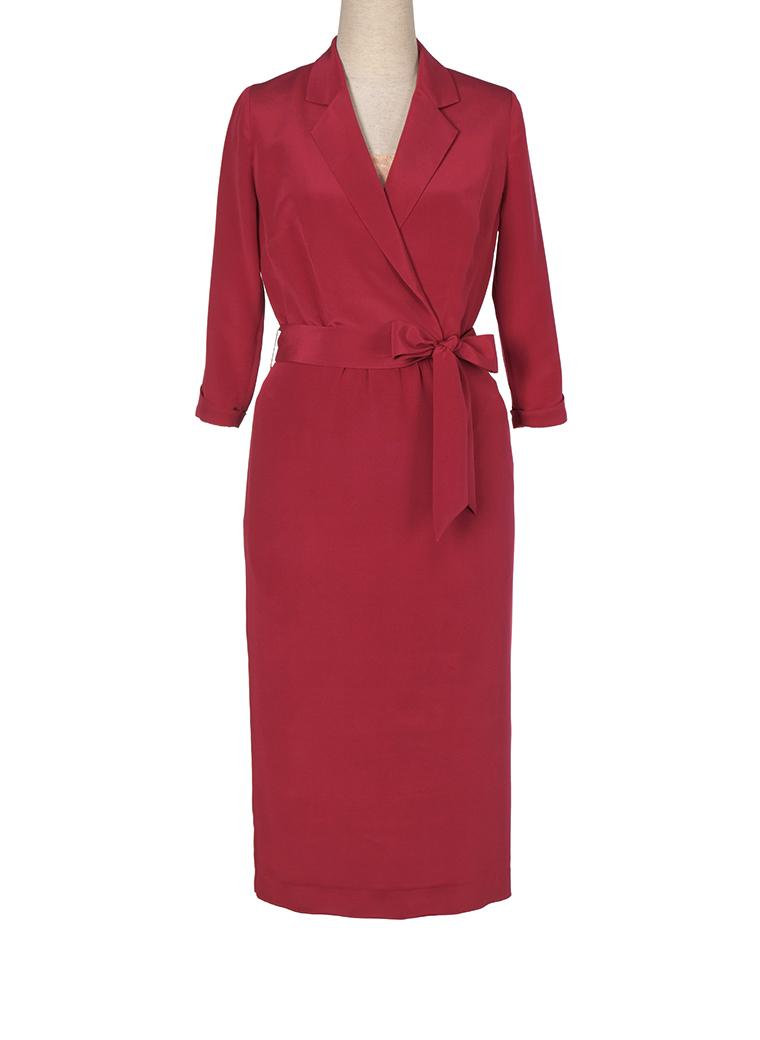 精量的真丝面料,饱满纯正的正红色,大方优雅的裹身式设计——这是一款当之无愧的“主场”礼服,在高级商务、出国参访等重要场合,可以让你从容地站上荣耀的舞台,唱一曲昂扬的生命“颂歌”…… |