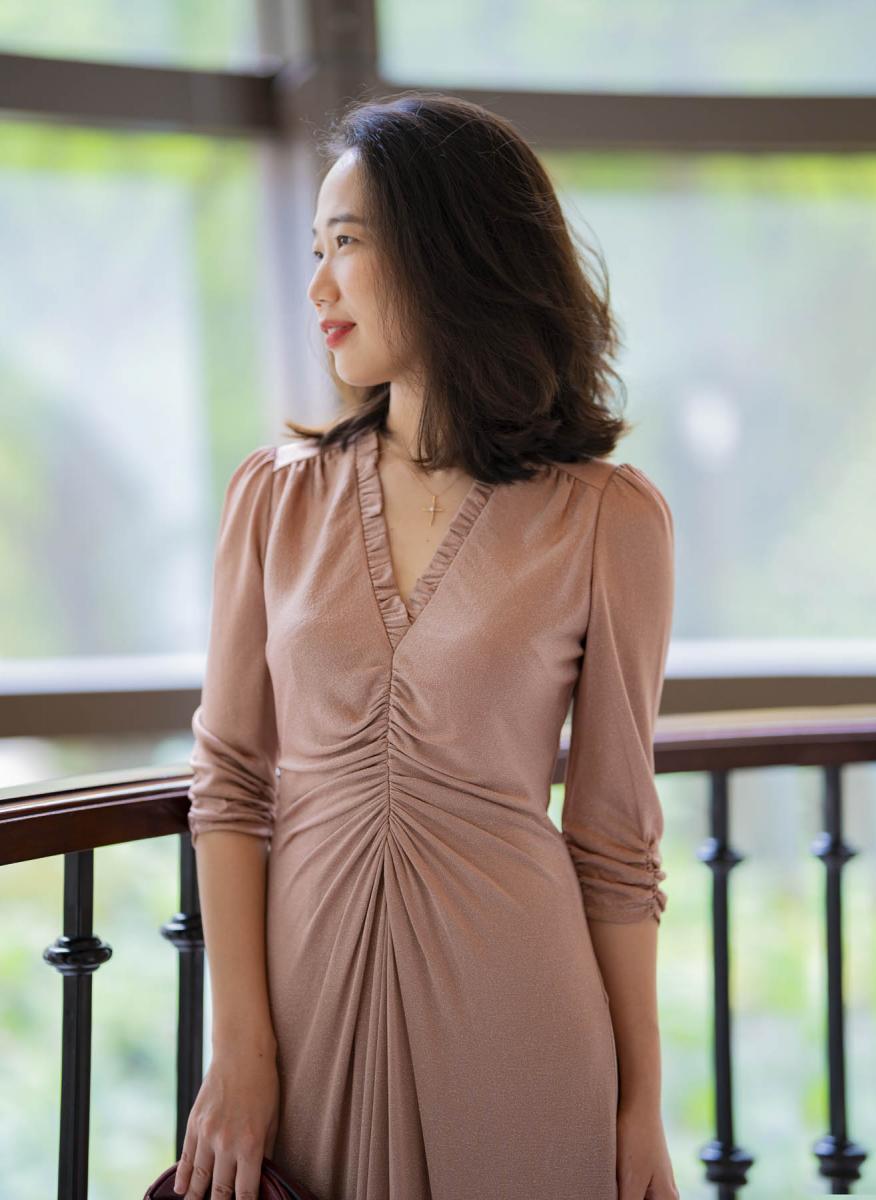礼服裙“流动的盛宴”行云流水的线条恰如其分地勾勒出女性曼妙身姿,细腻柔软有弹性的针织面料合宜地呈现既舒适自如又柔曼动人的盛会形象。雅致浪漫的粉色上闪耀淡淡光泽,增添一抹高贵华丽气质,又保留了谦逊柔和的女人味。长及脚背的裙长更显端丽庄雅姿态,精妙卓绝的褶皱是裙身最有识别性的设计,淑女的腰身就在层叠之中显出纤细优雅,流露出低调的性感和殷实华贵的底气与魅力。可以想见,一位穿着它的淑女自信从容地穿梭在流动的盛宴之中,她的笑意,她的姿态,她的言谈都让与之交谈者印象深刻,她又何尝不是这场盛宴中动人的一景呢?