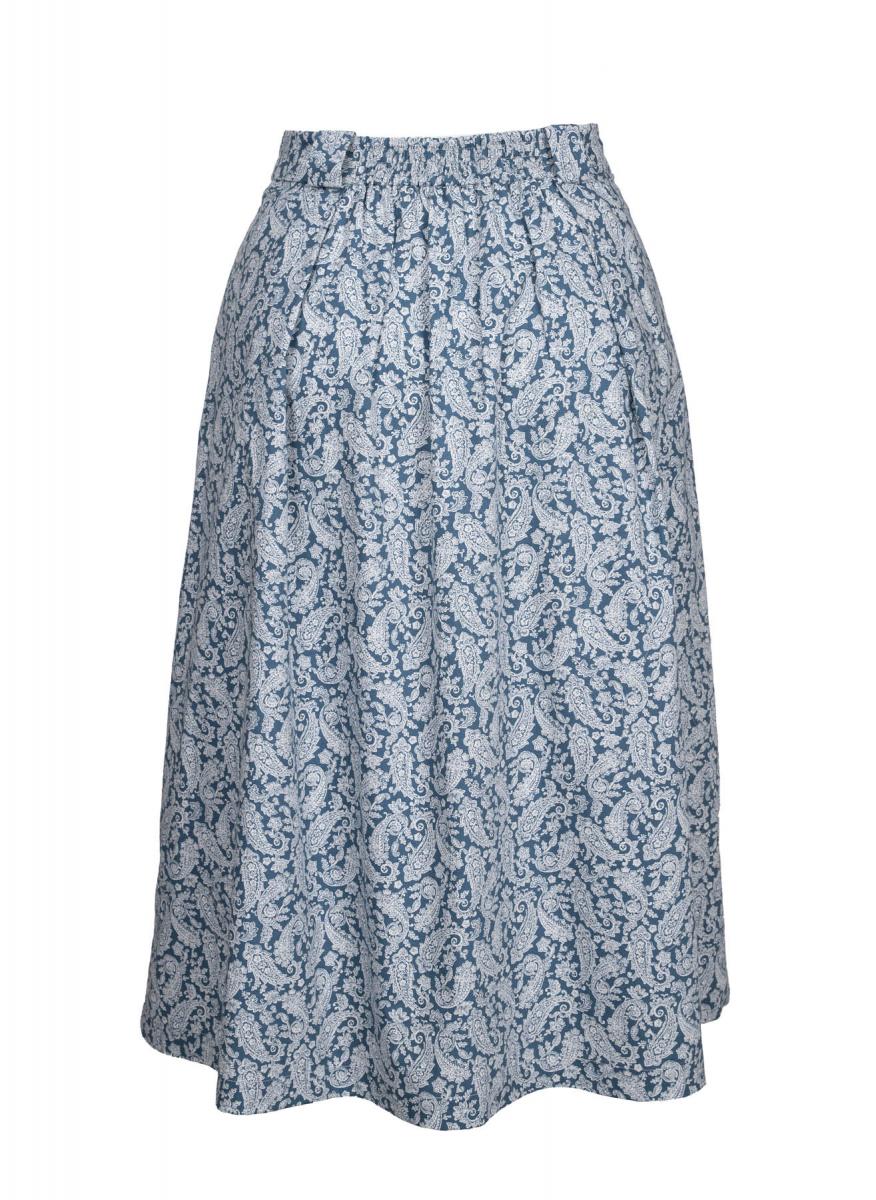 进口的全棉面料,明净的蔚蓝底色上印满了复古的白色佩兹利图案,为半裙带来了柔美清新的气质,是淑女们人见人爱的夏日单品。前门襟采用扣子代替拉链的设计,更添一丝复古的雅致。后腰巧妙地加入了一段松紧碎褶,为淑女们带来一份自由呼吸的舒适感。前倒褶的设计,更是为这条如花般绽放的裙子,增添了层层叠叠的涟漪之美。
