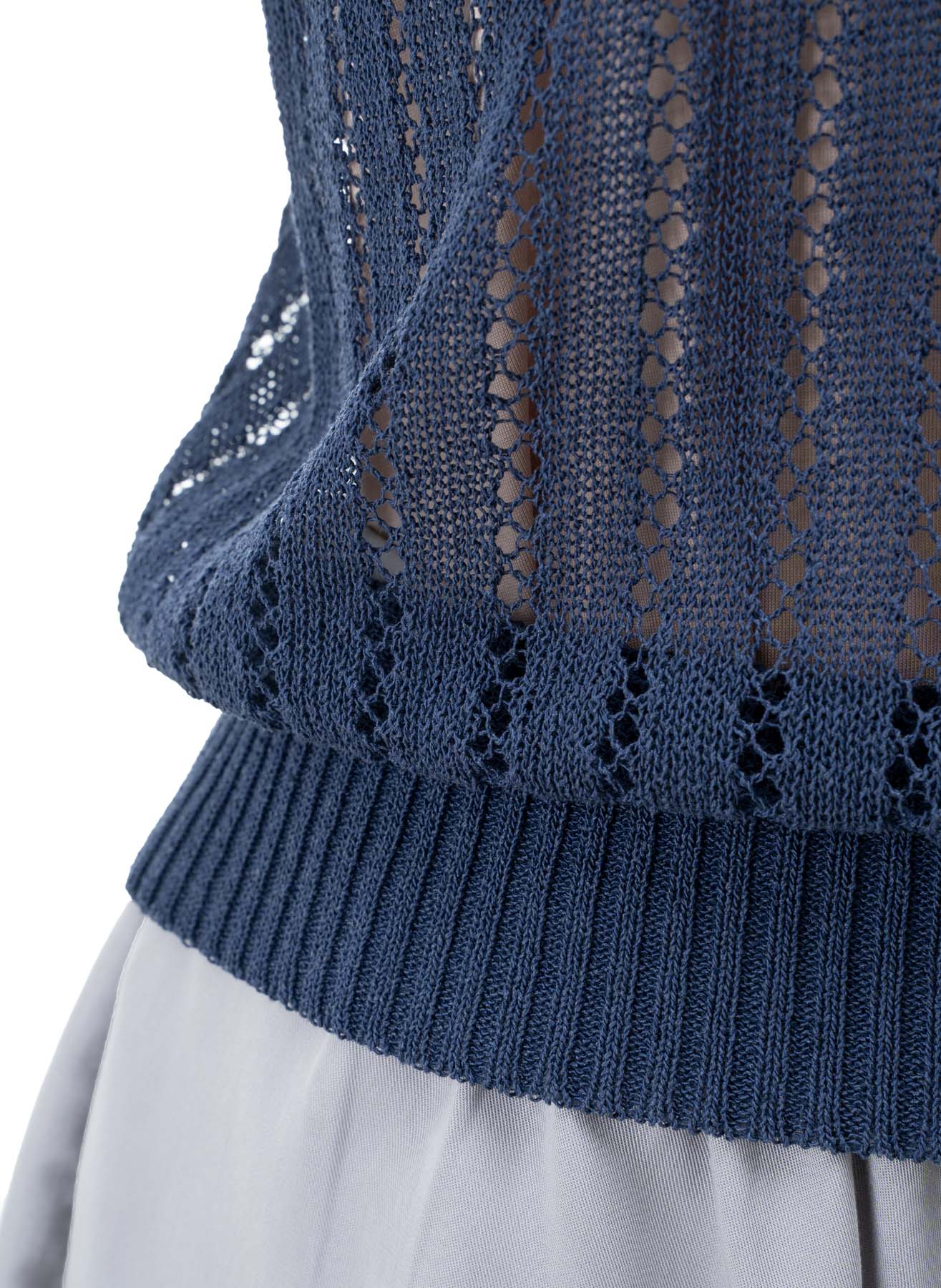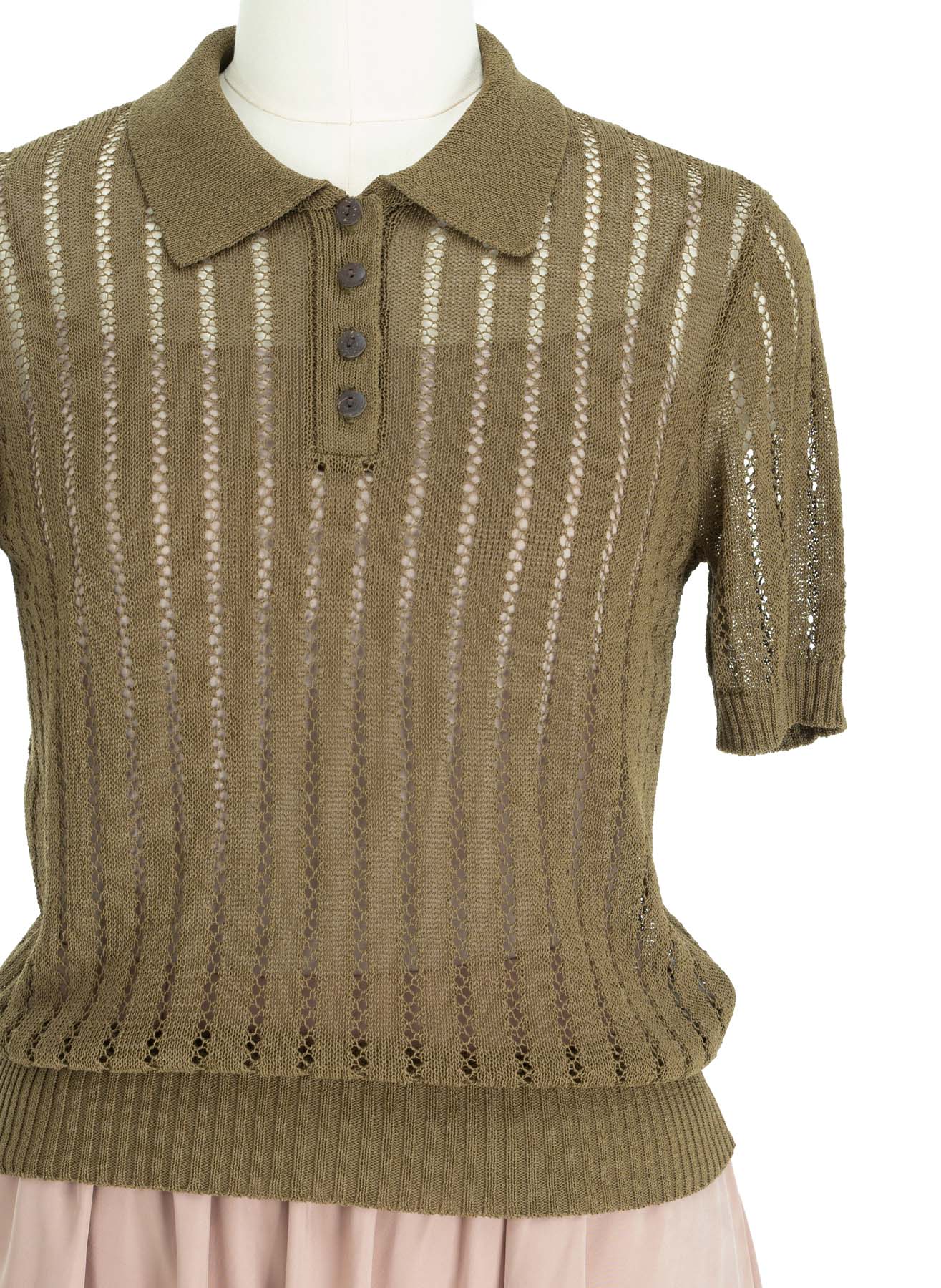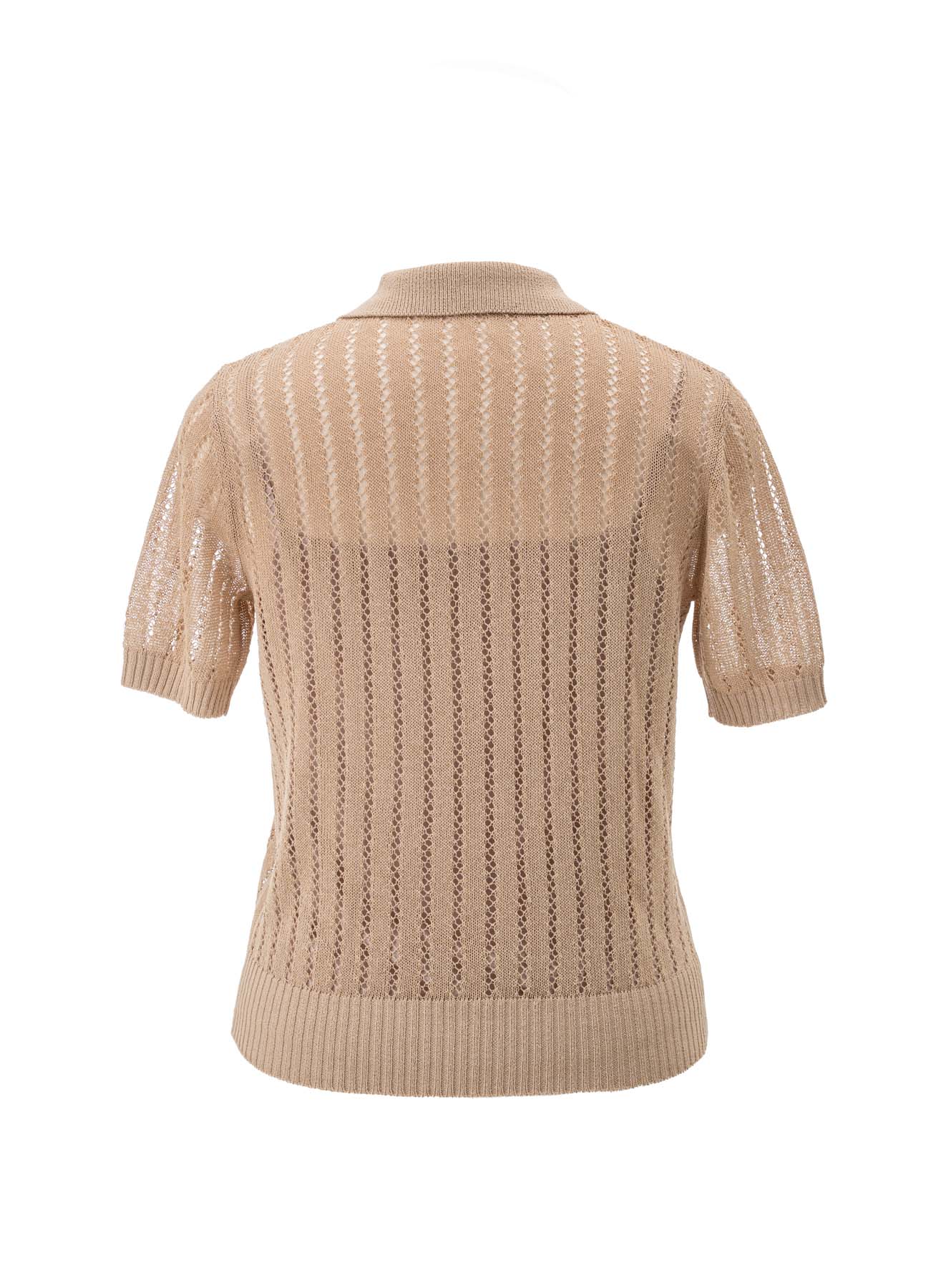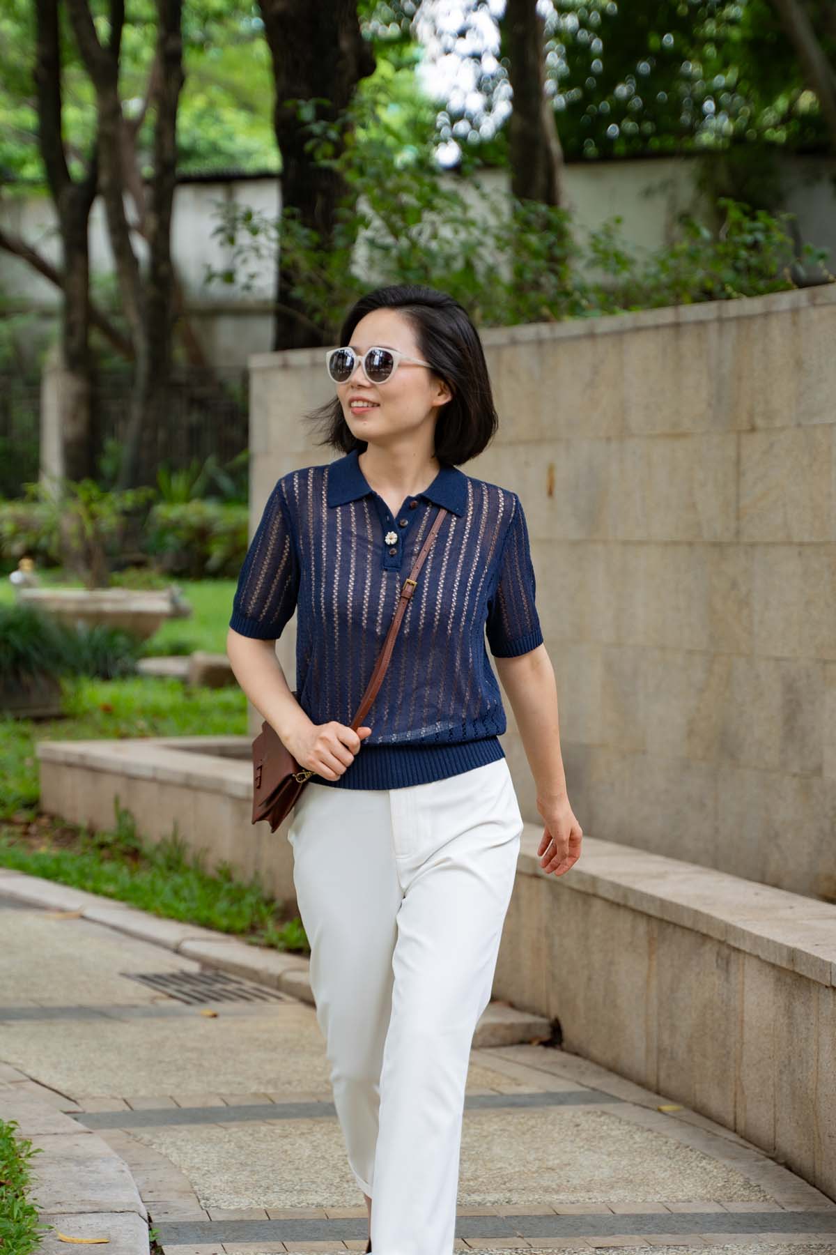 天丝亚麻混纺的纱线有舒爽的体感,精细的镂空花型形成雅致条纹,视觉上有无声修饰的效果,安静而雅致地表达对夏日的情思。经典POLO衫款型与镂空织法相结合,形成有品位的休闲风格,并贴心搭配浅卡其色吊带背心,免去搭配的烦恼,轻松展现含蓄的得体和充满艺术的露肤度。这一份轻盈的通透仿佛为炎炎夏日吹来一阵凉风,沁人心脾。