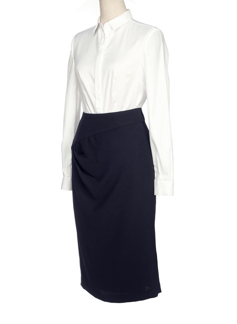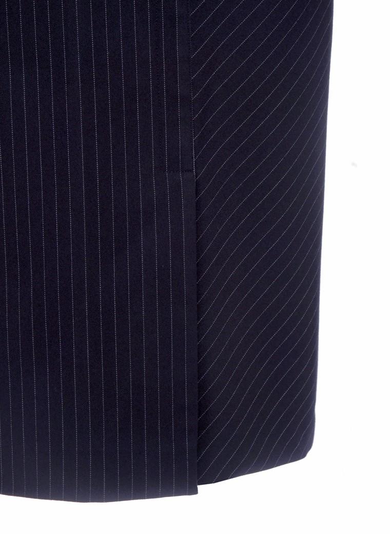 深沉的蓝色,慎密的条纹,精细的羊毛混纺面料;这一款基本款的铅笔裙最大的亮点,就是在规矩的条纹之中,于腰部做了相交线的突破设计,体现出maia’s铅笔裙的设计精髓——“节制的美德”,正是淑女迷人的魅力所在…… |