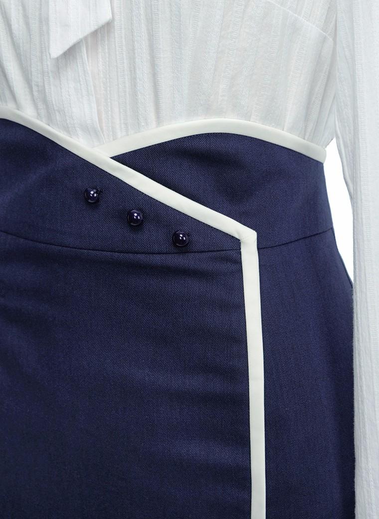 蓝与白的撞色,带来清新又深沉的韵味;高腰的设计、白色的镶边、精彩的扣饰——这一款品质精良、设计感十足的复古半裙,每一处精致的细节都在凸显着淑女的魅力,永远有着坚实而安稳的优雅分量…… |