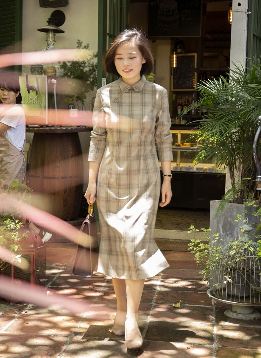 这款旗袍的设计传统却不古板,有着宜古宜今的诗意之美——古雅的褐色格纹、别致的异形领、花型的手工盘扣,以及袖口做三角形的拼接小暗扣设计,仿佛有浓浓的书香气息扑面而来——“爱读诗篇的女子”,你的美润物无声,却有着耐人寻味的无穷魅力…… |