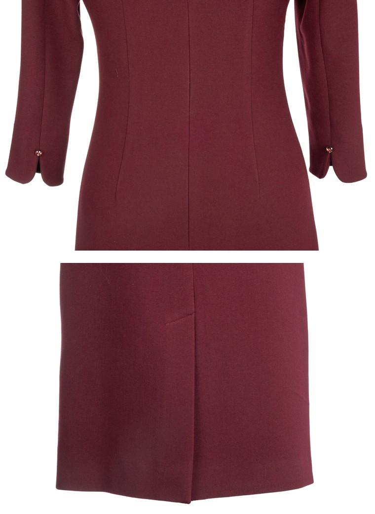 这是一款旗袍韵味的礼服,仿佛带来了一种洁净与幸福感——雍荣的酒红色、花瓣式的弧型领和袖口设计、还有同色系的水晶扣做点缀……这一朵盛开的“心灵玫瑰”,要绽放在喜悦欢庆的时刻,绽放在人生的恩典之中…… |