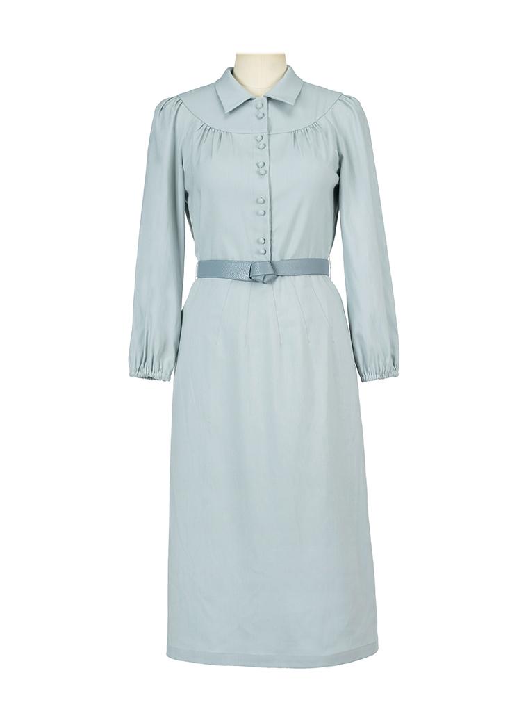 丝棉的轻盈通透、碧绿的温润深邃,带来了江南碧水般的动人美感……这款淑女连身裙,采用了古典的大V型领口,再配上系扣的腰封设计,呈现出灵动的优美身姿;而镶有蕾丝花边的真丝内搭裙,更衬托出妩媚的美丽姿容——淑女之美,就是如此的意境深远、意味深长……