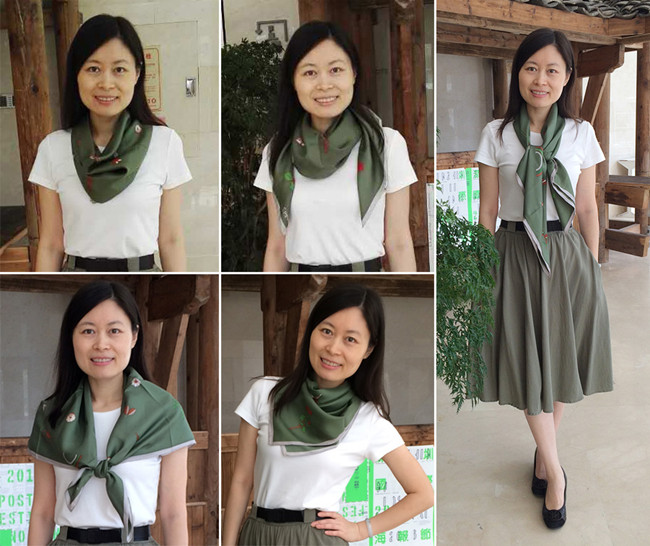 从衣服与丝巾的搭配,到场地的选择,到丝巾的系法,到摄影,全部由她独立策划完成。我只需要听她的话,做好模特就行了。