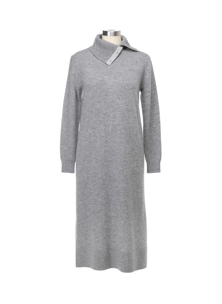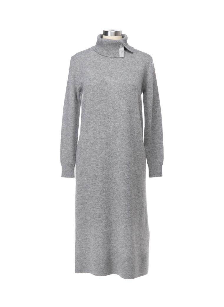 此款质地柔软、质感温暖、有着极佳弹性的浅灰色纯羊毛针织连身裙让人爱不释手!优雅有余地的轮廓和有修养、谦逊、知性的灰色调结合让不同体型、不同气质的淑女都能穿出属于自己的那份智慧和底气。暖心的高领的设计,巧妙地在领口加入3粒扣的开襟设计,可根据气温和当日搭配选择不同的领型,营造丰富的穿着风格。侧开衩使得行走更加从容优雅,无论外穿还是作为内搭都是秋冬季节的必备款。穿上它,让冬日也可以轻松美丽!