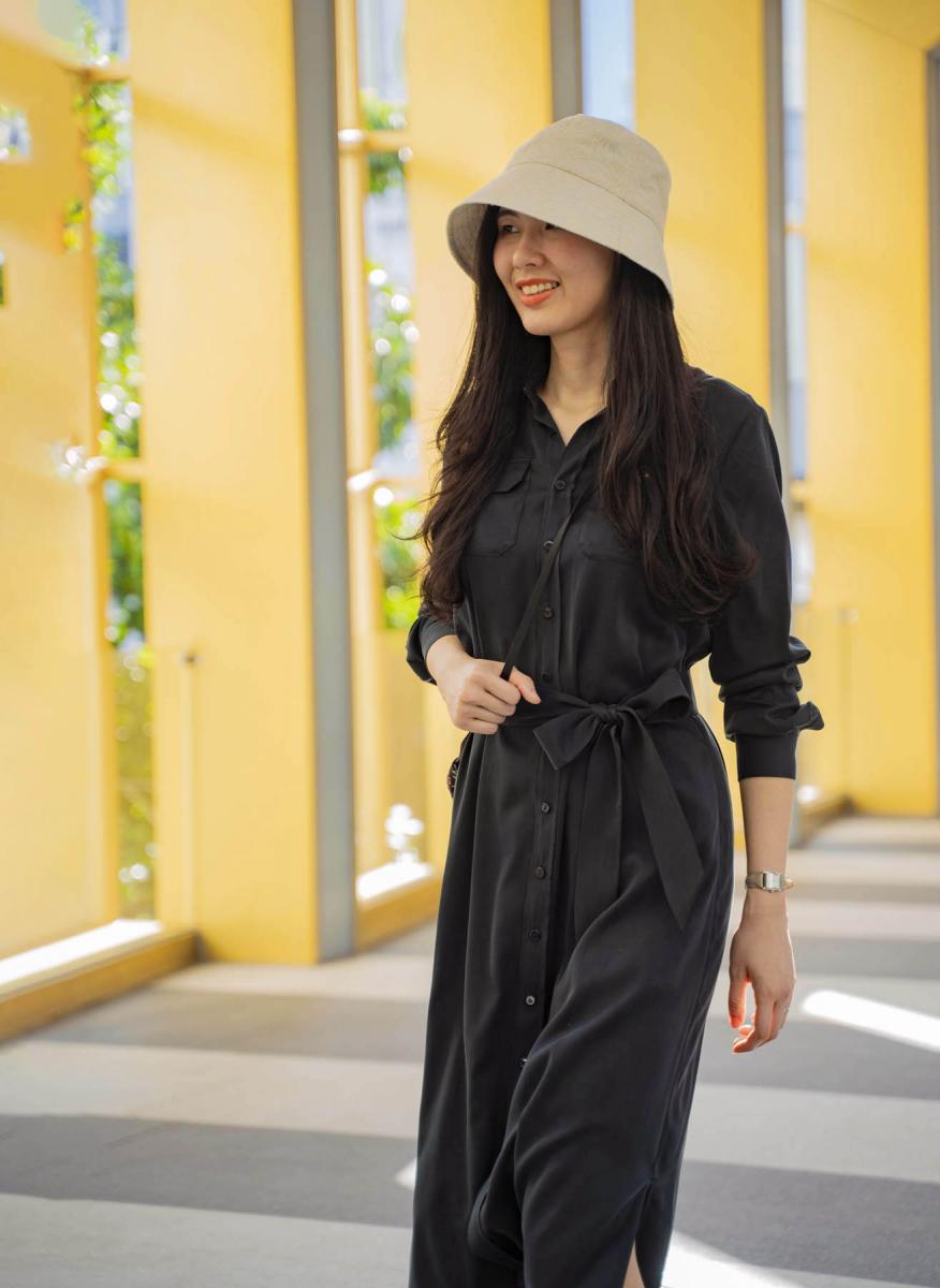 深邃的黑色与飘逸的桑蚕丝结合,让如雾般神秘的黑色增加轻盈的潇洒,犹如行书落笔一气呵成的畅快;砂洗的黑色褪去浓墨的刚硬,如历经时间阅历的淑女褪去身上的凌冽,笔触中多了谦和与婉柔。经典的衬衫裙如经典书籍隽永耐品,细细阅读,直身的版型增添不拘束的洒脱,前胸经典的猎装式贴袋增添淑女的帅气潇洒,裙摆两侧的设计令行走更加自如灵动。
