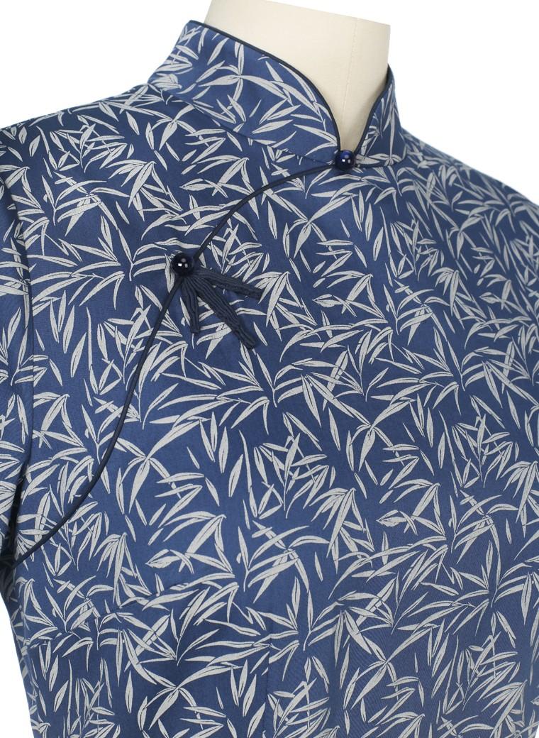 此款旗袍非常适合夏季穿着。品质极佳的进口纯棉面料,有着微微光泽感的灰蓝冷色调,呈现出清凉舒爽的质感;精妙的水墨竹叶图案,呼应着精致的水晶扣和竹叶型手工盘扣,仿佛引领着我们,徐徐地步入那“幽竹静雨”的意境之中——那是一颗安静的心,才能感受到的静谧与美好…… |