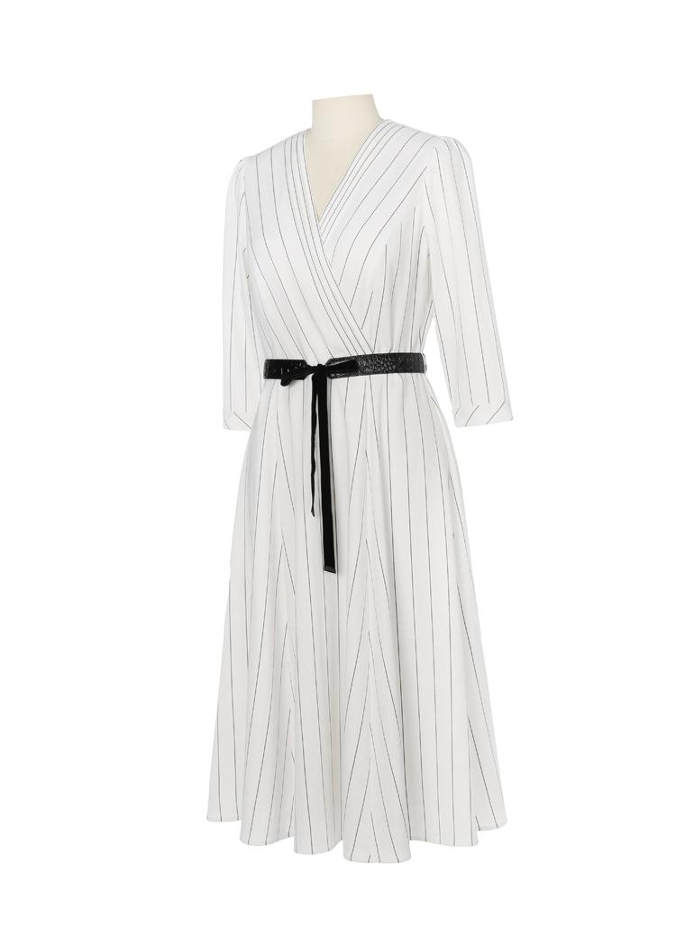 闪亮的流星划过晴朗的夜空,夏日的晚风撩动起她的秀发——就让奇丽的思绪飞扬起来,让喷薄的才情流转起来吧,她要把这一轮清风霁月,永远地描画在生命的底布上…… 这款围裹式淑女连身裙,采用白底黑条纹的人棉混纺面料,有着极好的垂坠感;其交叠式的领口有着曼妙的风琴褶设计,配上随附的黑色波点丝巾,带来了引人入胜的美丽遐思——“清风霁月”般的女子,是多么的清新脱俗、多么的恬静美好……